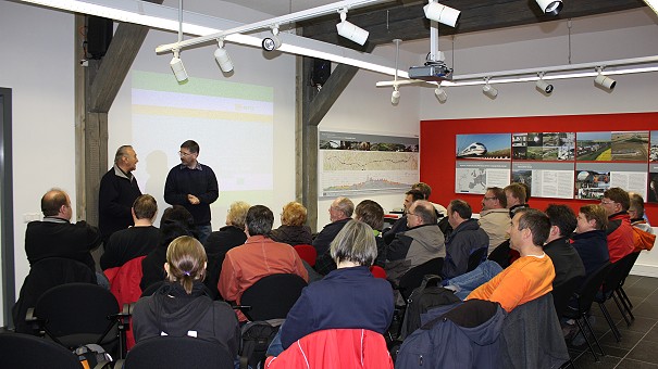 Unsere Beteiligung an der Pößnecker Modellbahnausstellung hat interessante Kontakte ermöglicht. Nicht nur, dass wir gute Modellbahnanlagen kennenlernen durften, es ergab sich auch ein Gespräch mit Robby Mörre, bekannt aus der MDR Sendung "Auf kleiner Spur". Er war von unserer H0e-Anlage 'Schmalspurig durchs Reichsbahnland' begeistert und plante sie gleich für seine nächste Sendung am 2. Weihnachtsfeiertag ein. Hierzu rückte am Samstag, 27. November 2010 ein Filmteam an, um in einem rund 7-stündigen Drehmarathon Material für die Sendung aufzuzeichnen. Unter der Leitung von Robby Mörre nahmen Peter Zielinski (Kamera) und Thorsten Heitmann (Ton) die H0e-Anlage ins Visier. In einer Drehpause überreichten Manfred Hösch und Dennis Philipp ein Falls - Gefrees Buch als Gastgeschenk. Während die Erbauer Dieter West und Volker Seidel Rede und Antwort stehen mussten, kümmerten sich Karin Hösch, Peter Simon und Christian Köhler um das leibliche Wohl unserer Gäste. Das MDR Fernsehprogramm vom 2. Weihnachtsfeiertag finden sie hier. Siehe auch Termine. |