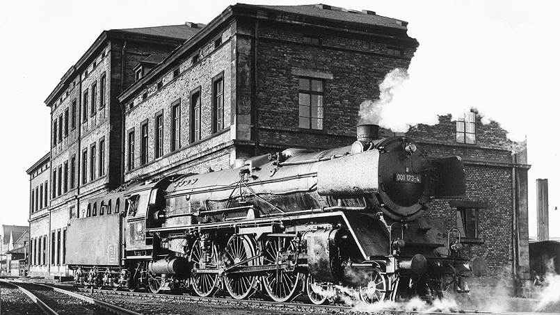 Da man den Neukessellokomotiven der Baureihe 01 nachsagte, sie seien nicht so einfach in der Bedienung und Feuerführung gewesen, setzte man sie gerne zusammen mit einer Altbau 01 ein. Der Nachschuss beleuchtet das imposante Triebwerk der ab 1926 in Dienst gestellten Einheitslokomotiven. Die zuletzt in Hof beheimatete 001 008-2 bei Borsig mit der Jubiläumsfabriknummer 12000 gebaut, wurde als erste 01 am 28. Januar 1926 in Dienst gestellt. Sie ist heute bei der DGEG in Bochum-Dahlhausen als nicht betriebsfähige Museumslok erhalten. Foto: Klaus Michael Zeuner |