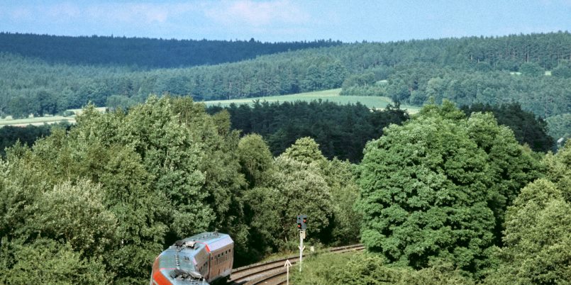 Ab Juni 2001 rollten dann endlich die Diesel-ICE der Reihe 605, für die die Umfahrung von Neuenmarkt gebaut worden war. Niemand ahnte damals, dass dies nur ein sehr kurzes Gastspiel werden wird - keine 18 Monate waren die Züge hier unterwegs, bis ein Unfall ihren Einsatz zwischen Dresden und Nürnberg beendete. Foto: Roland Fraas |