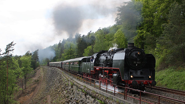 Mit 01 118 und 01 1066 nahmen insgesamt vier 01er an der Veranstaltung "Auf geht's zum Eisenbahnjubiläum" im Rahmen des Schnellzugloktreffens am Samstag, 22. Mai 2010 teil. (Daneben auch zwei Vertreter der Spielart DR-Reko 01 - 01 509 der Press (als 01 0509-8) und 01 533 der ÖGEG). Auf dem linken Bild ist die Ulmer 01 1066 als Zuglok und die 64 491 der DFS als Schiebelok auf der Schiefen Ebene unterwegs. Mit zweimal 01 den Berg hinauf: 01 118 als Vorspannlok (kohlegefeuerte Zweizylinderausführung) und 01 1066 als Zuglok (ölgefeuerte Dreizylinderausführung), unterstützt durch die Schiebelok 64 491 auf dem Weg von Neuenmarkt-Wirsberg nach Marktschorgast. Die Schiebelok hatte auch die Aufgabe, bei der Talfahrt als Zuglok zu fungieren, sodass das Umsetzten in Marktschorgast eingespart werden konnte. Die Bilder gibt es als Lightbox: bitte anklicken. Fotos: Volker Seidel |